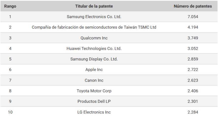 Las 10 principales empresas por número de patentes estadounidenses obtenidas en 2025*