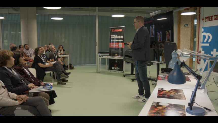 A la jornada, asistió Frederic Vaneesbeck, Product Specialist de Canon Bélgica, experto en impresión fotográfica, para impartir una sesión formativa centrada en la impresión profesional y la gestión del color. El seminario abordó de manera accesible cuestiones clave para lograr resultados consistentes como la coherencia entre pantalla y papel, la correcta selección de soportes y acabados, la preparación de archivos de gran formato y la toma de decisiones creativas apoyada en técnicas como el soft proof.