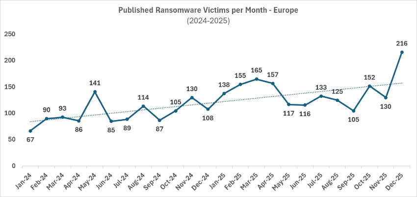 Imagen 1. Víctimas de ransomware publicadas por mes – Europa (2024 – 2025).