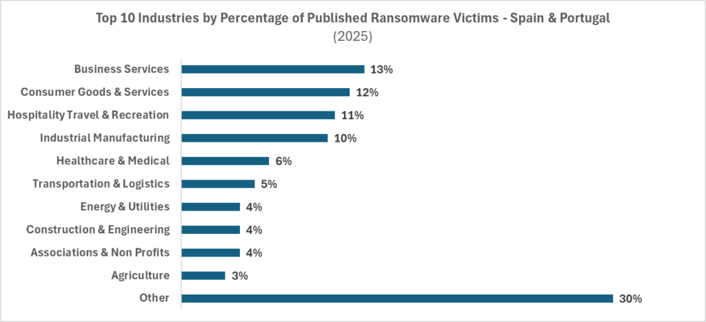 Imagen 2. Las 10 principales industrias por porcentaje de víctimas de ransomware publicadas – España y Portugal (2025).