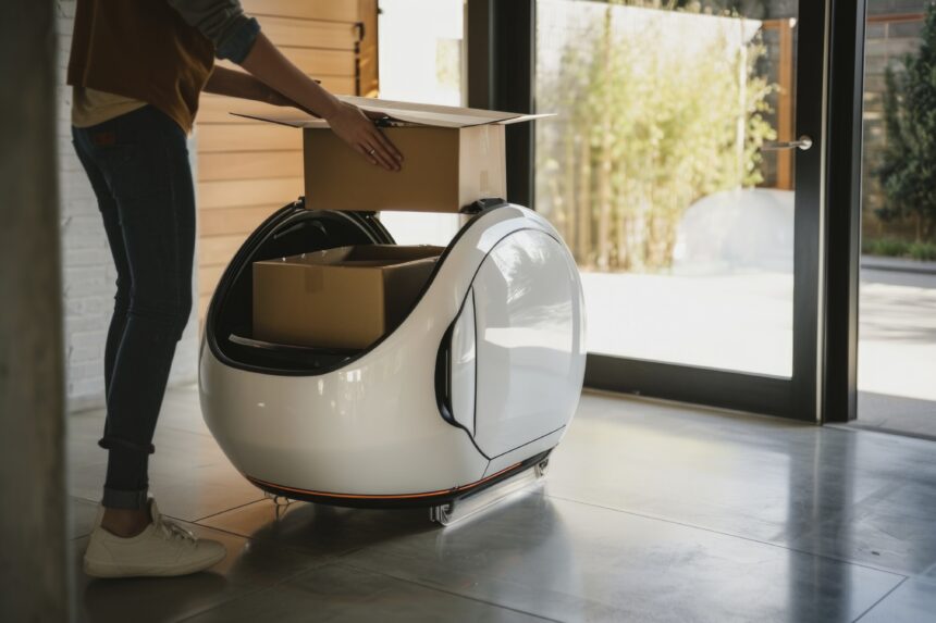 island, a person is loading a delivery box into a mini robot, in the style of soft and rounded forms, booru, light white and light bronze, smilecore, futuristic robots, rollei prego 90, polished concrete --ar 3:2 --v 6 Job ID: 3543e743-4dc3-40fb-89be-ce179d1376bc