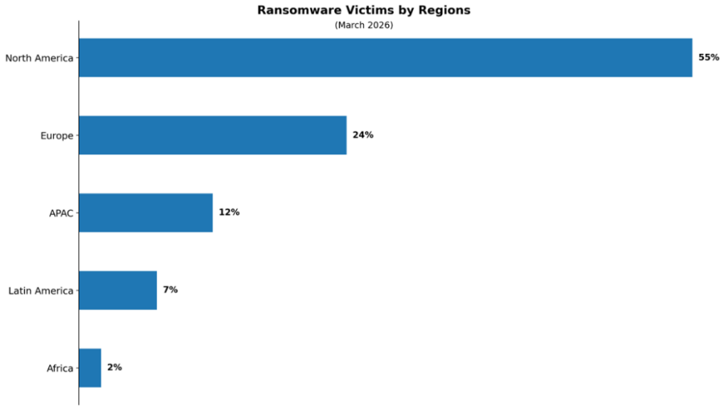 Imagen 2. Víctimas de ransomware por regiones en marzo de 2026.