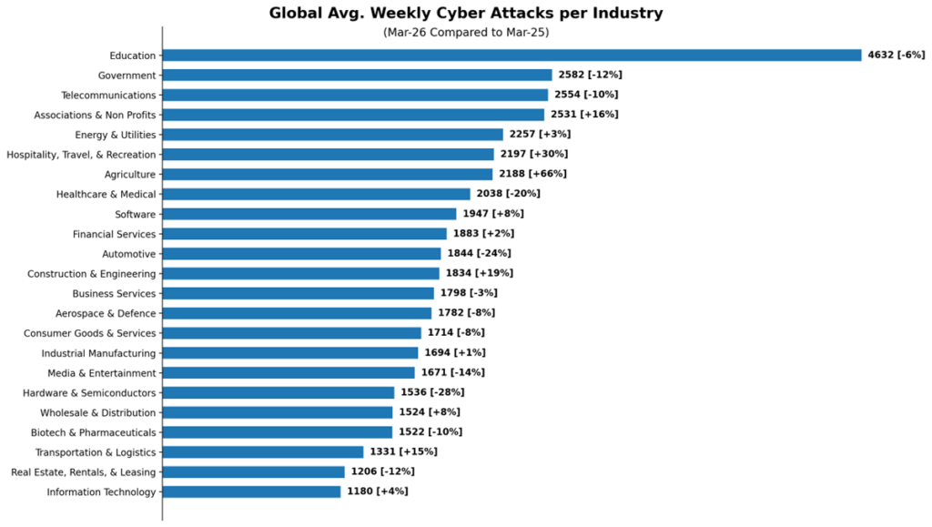 Imagen 1. Media mundial de ciberataques semanales por sector (marzo 2026 comparado con marzo 2025).