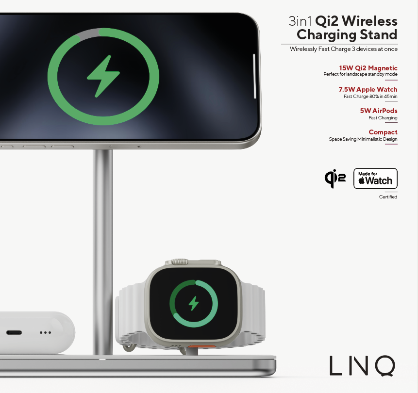 Con la intención de ofrecer al usuario, en el caso de que necesite cargar varios dispositivos a la vez, un solo accesorio, Linq también ha diseñado el 3-in-1 Wireless Charging Stand (permitiendo cargar iPhone, Apple Watch y AirPods simultáneamente a 25W) y el 2-in-1 Foldable Charging Stand (solución plegable y compacta ideal para viajes).